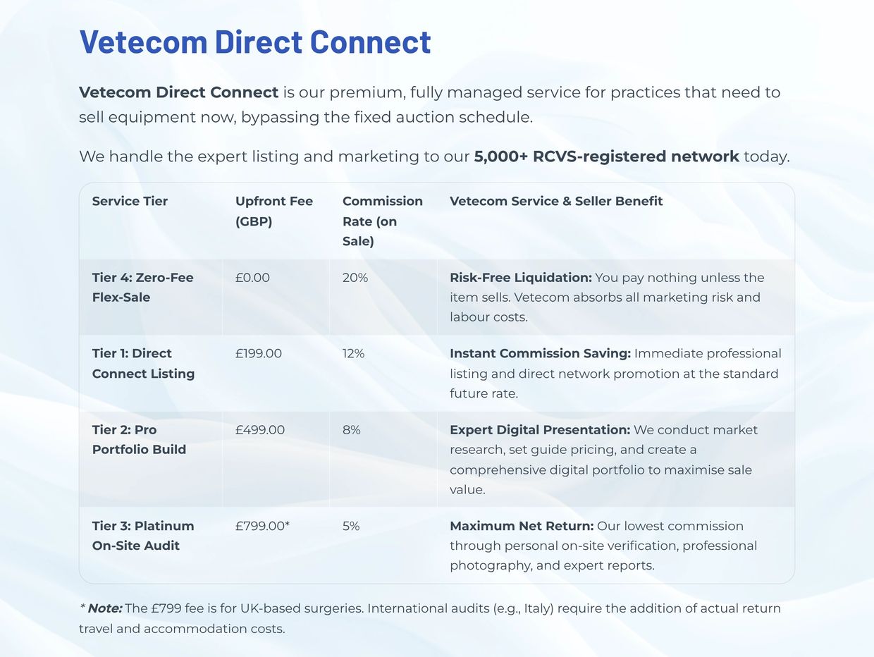 * Note on International Audits: The £799 fee is for mainland UK-based surgeries only. Northern Ireland, European and International audits (e.g., Italy) require the addition of Vetecom's representative actual return travel and accommodation costs. This supplement will be quoted to you transparently and up-front before any commitment, ensuring you still receive the maximum net return on your high-value assets.